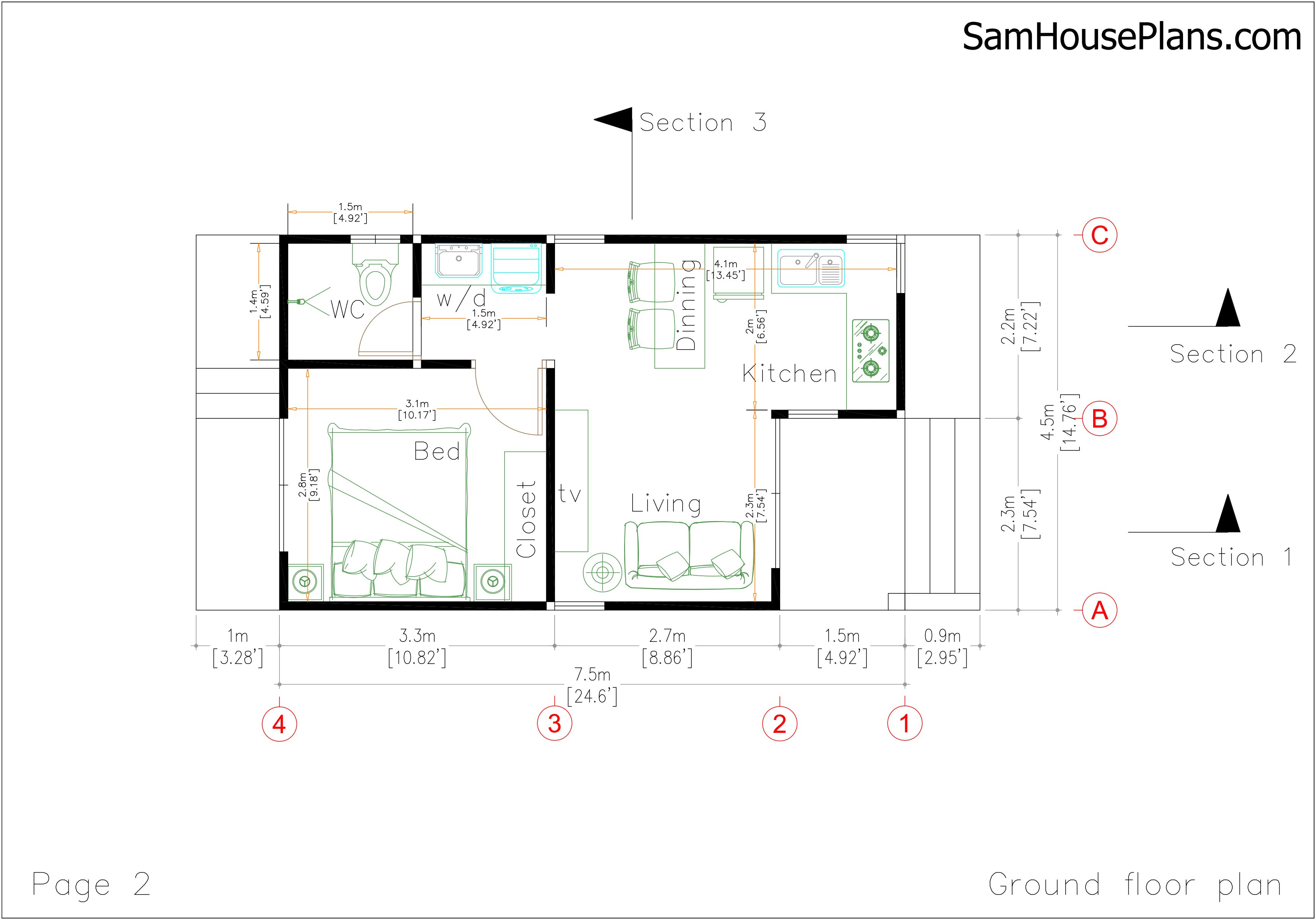 Small House Plans 15x25 Ft With One Bed 4 5x7 5 M Gable Roof